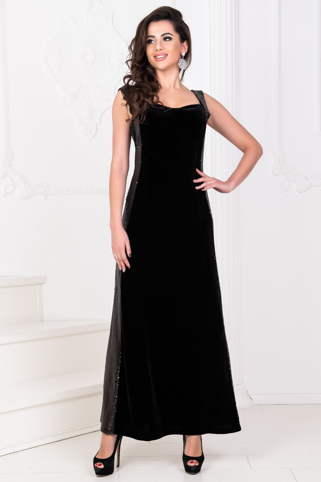 Элегантное длинное вечернее платье черного цвета выполнено из благородного бархата. Боковые вставки и бретели расшиты изящными пайетками. Юбка платья расклешается книзу. Модель идеально подойдет для праздничной вечеринки и торжественного мероприятия.